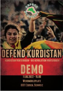 Diesem Aufruf folgend rufen wir als solidarische Organisationen, Gruppen und Kollektive in Zürich alle zu der Demo am 11. Juni 2022 in Zürich auf. Wir rufen dazu auf, eine soziale Revolution in allen Lebensbereichen, die danach strebt, die patriarchalische, kapitalistische und koloniale Mentalität zu überwinden, und die zu einer Inspiration für Bewegungen in der ganzen Welt, die für die Befreiung und das Selbstbestimmungsrecht der Völker kämpfen, geworden ist, gemeinsam zu verteidigen. Hoch die internationale Solidarität! #DefendKurdistan